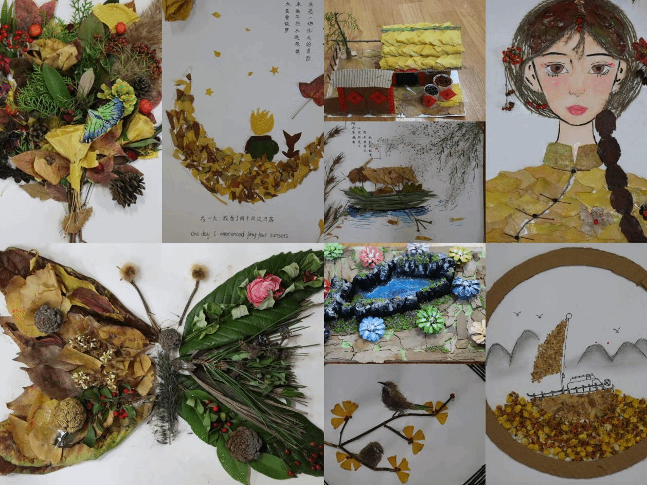 本次大赛以“秋冬的心事”为主题,鼓励同学们利用校园内的落叶、枯枝、种子等自然素材,通过拼贴、绘画等多元形式,创作出兼具视觉美感与心理内涵的贴画作品。参赛作品题材丰富,涵盖人物、建筑、风景、动物等多种意象,同学们以自然为媒介,将内心深处对季节变迁的感悟、对生命哲学的思考,转化为一幅幅生动而充满温度的艺术画面。