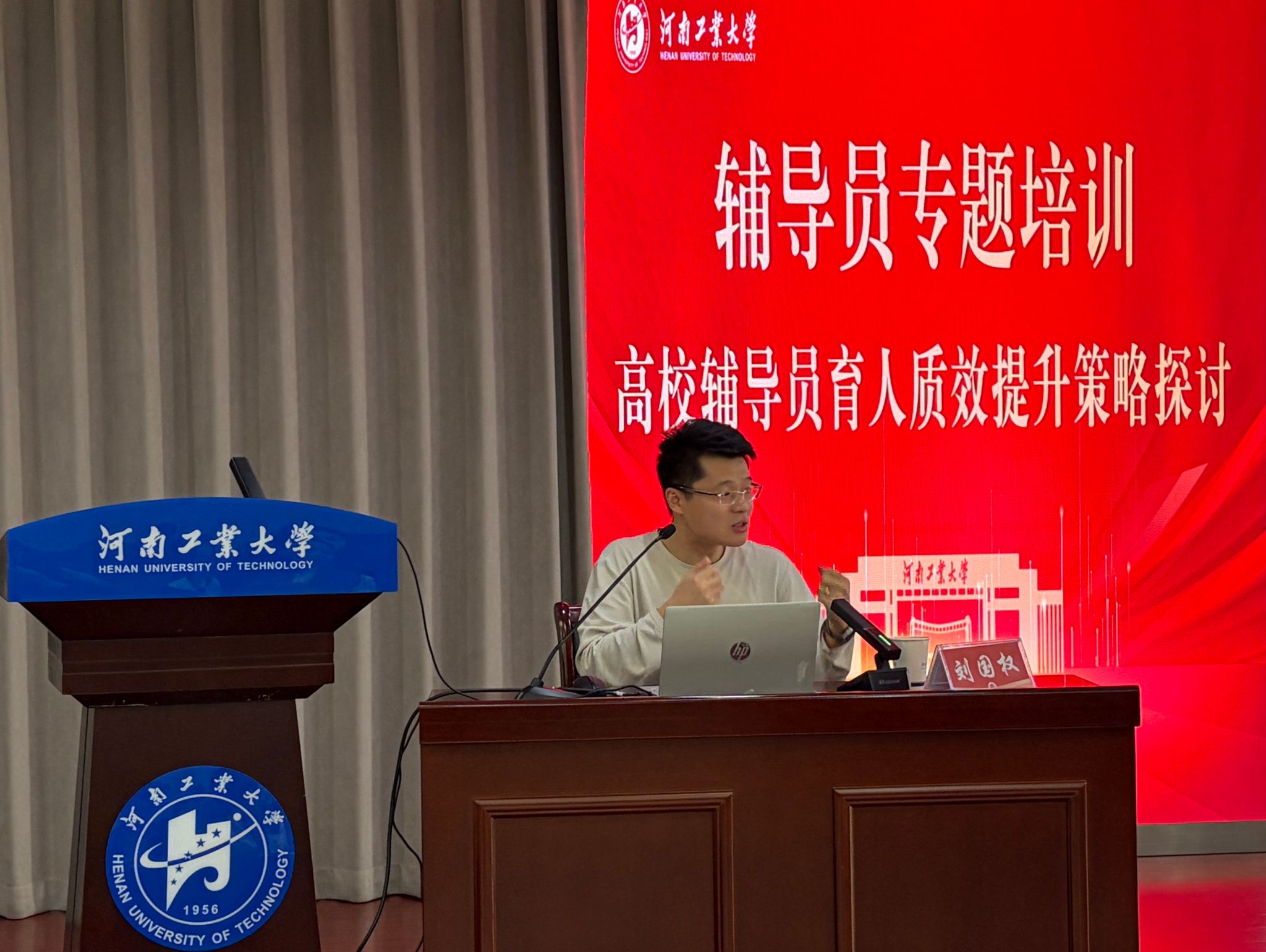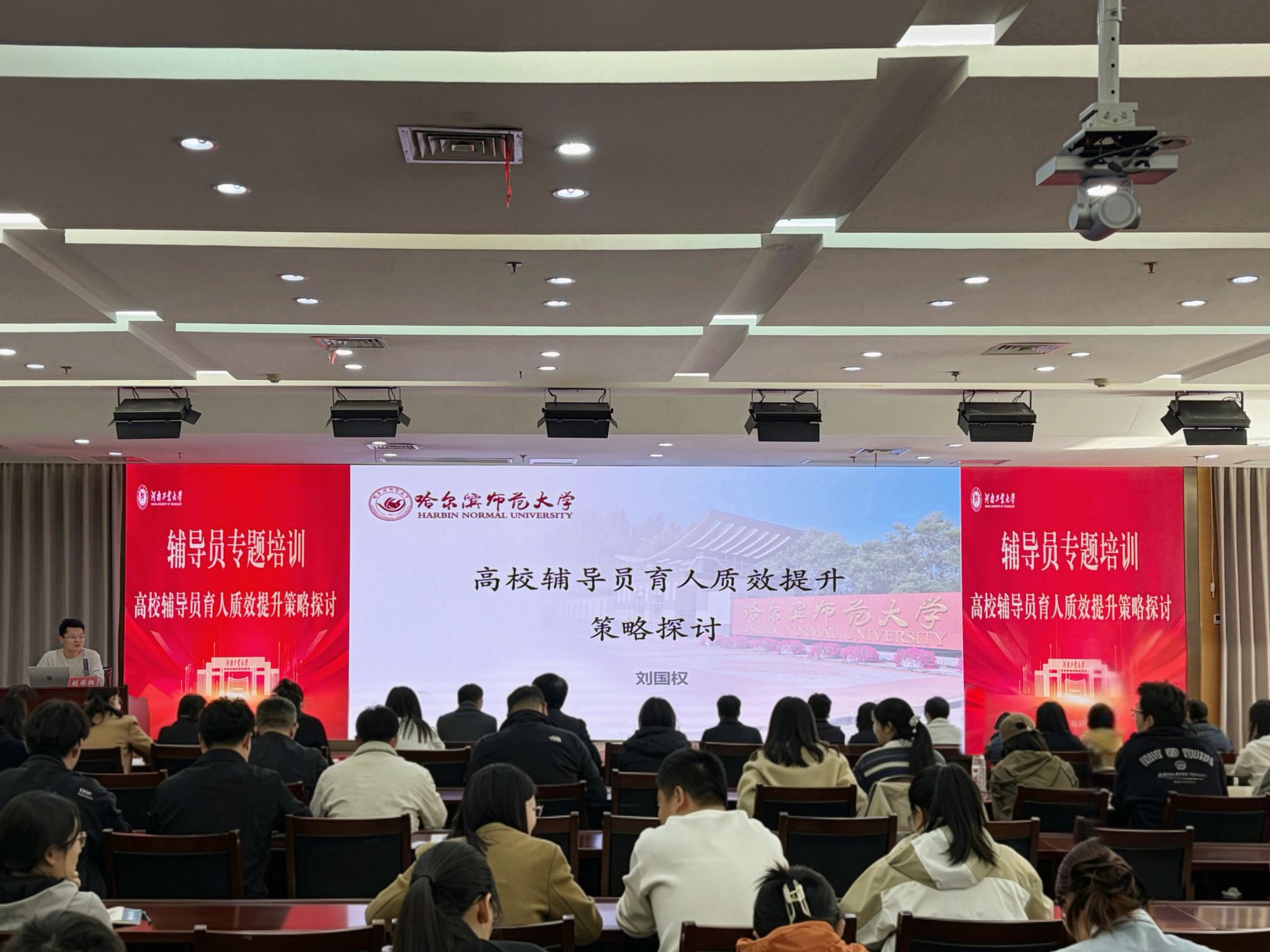 培训特邀全国最美高校辅导员、全国高校思想政治工作中青年骨干、全国高校网络教育名师、全国高校辅导员名师工作室主持人、哈尔滨师范大学融媒体中心主任刘国权老师担任主讲嘉宾。刘老师以“高校辅导员育人质效提升策略探讨”为主题,为与会人员带来了一场内容详实、贴近实际、指导性强的专题报告。