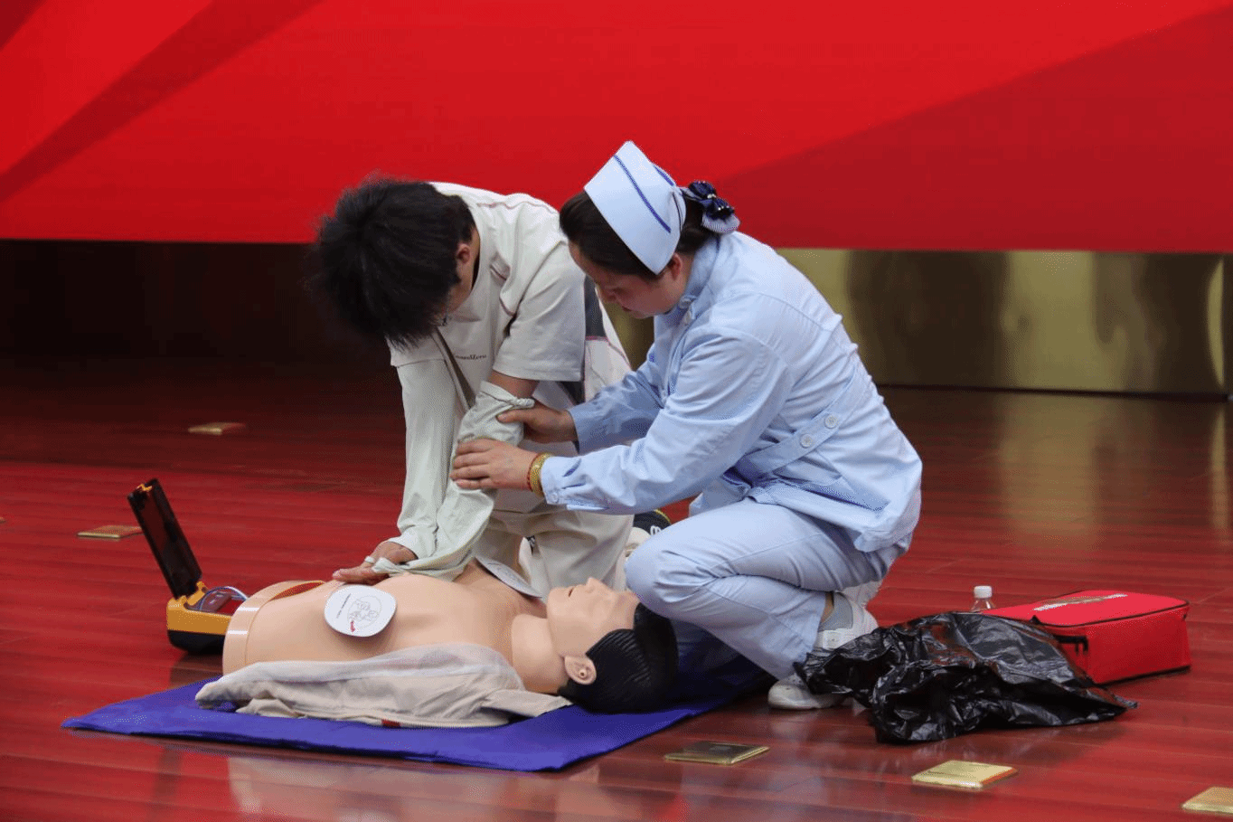 本次培训邀请校医院医务科科长陈辉老师担任主讲,围绕运动场景高发风险展开系统教学。培训内容涵盖心脏骤停急救、运动损伤的现场处置、皮肤擦伤清洁包扎技巧,以及腹痛呕吐等突发状况的应急处置。培训现场学生热情高涨,在医护人员的指导下分组进行急救场景模拟训练。通过此次专项培训,参训学生进一步提升了安全意识,掌握了实用、科学的防护知识与技能,从源头上降低了运动安全风险。