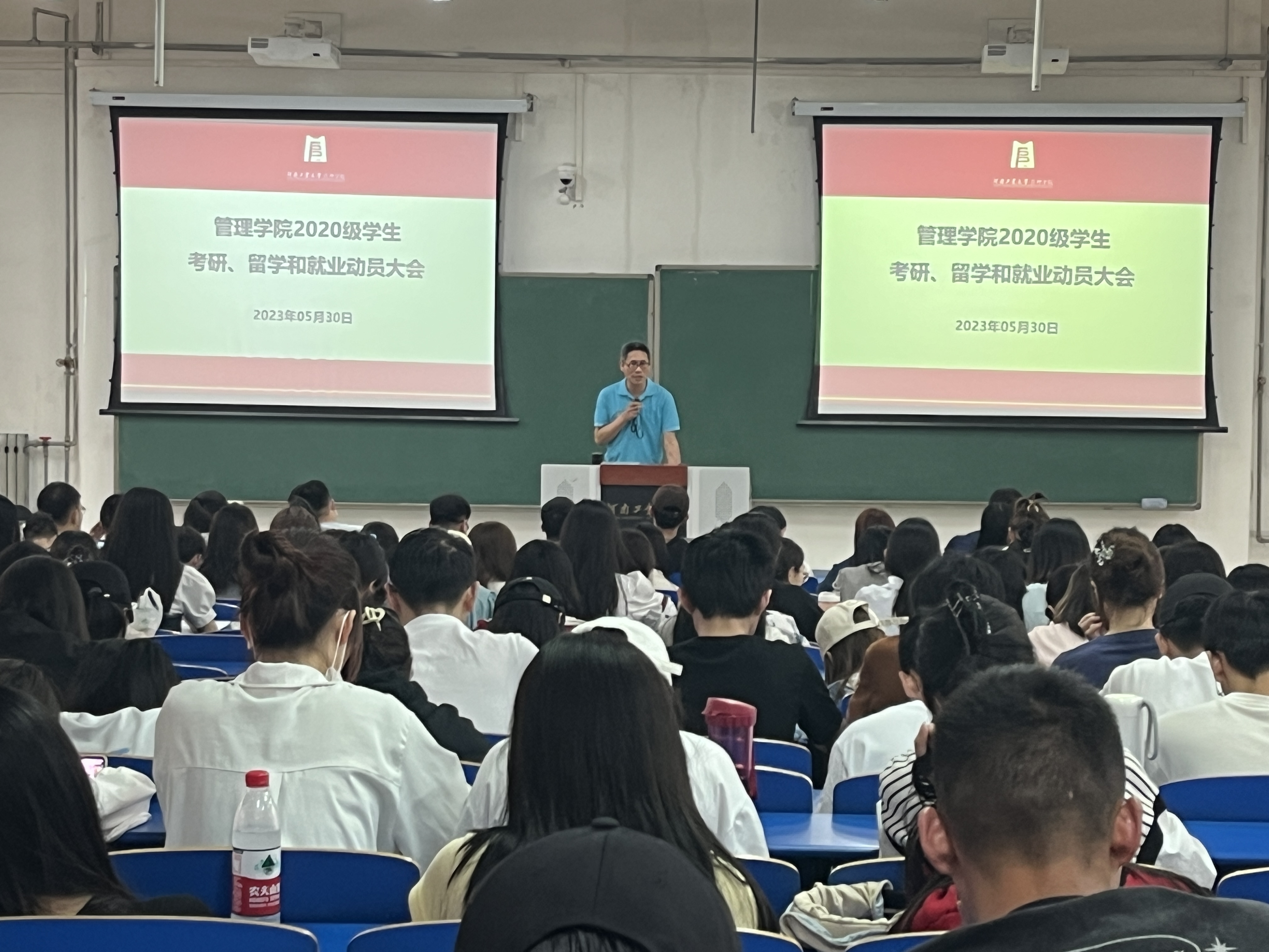 5月30日下午,学院在3101和3135教室举行2020级学生考研、留学和就业再动员大会,管理学院党委副书记魏涛、副院长李凤廷,国际教育学院项目办主任王优优、英路留学咨询部经理甄舆到场做动员交流。会上,李凤廷从近几年考研形势、学院各专业录取情况、初试和复试准备等几个方面做了详细介绍,鼓励同学们用信心、决心和恒心,实现成就破茧成蝶的蜕变;魏涛结合学生所学专业特点和优势,结合学院近三年毕业生考研和就业情况,为同学们进行了客观和有针对性的分析,希望同学们坚定目标,做好规划,奋力拼搏,实现梦想;王优优老师从国际教育学院合作交流项目、学生留学申请条件和流程、留学费用和准备材料方面,做了如何申请国外大学硕士研究生的精彩分享;甄舆分享了往届毕业生申请到新加坡国立大学、约翰霍普金斯大学的留学案例,以及国外留学学习的培养方式,希望同学们拓宽眼界,提高认知和丰富经历。同学们纷纷表示,学院的关怀和帮助让他们倍感温暖和鼓舞,增强了他们面对未来挑战的信心。