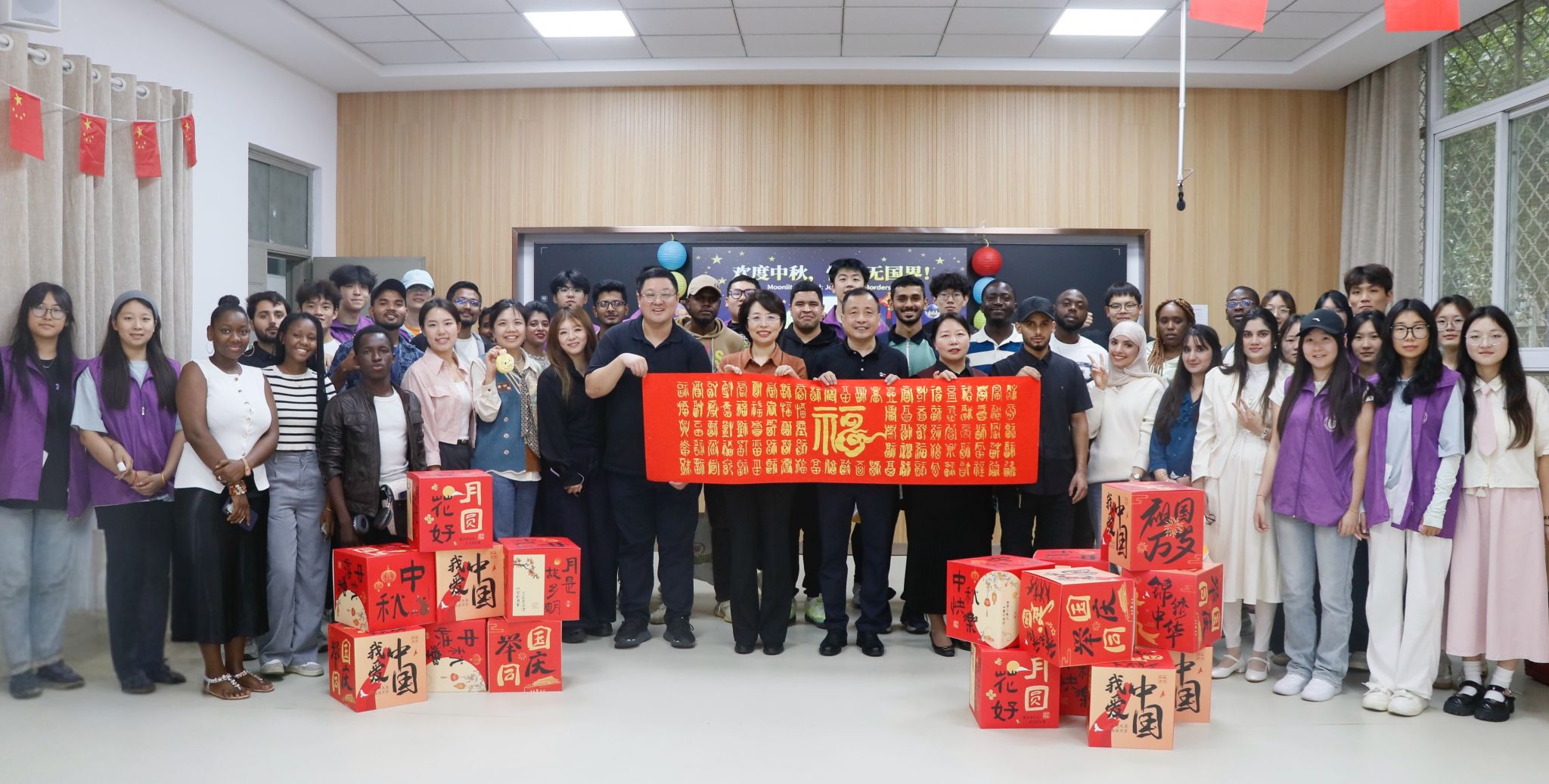 游园会结束后,学院领导、教师与中外学子在百福图前合影留念,学院还特意为留学生们准备了具有中秋特色的伴手礼,表达节日的真挚祝福。此次中秋活动不仅是一次节日的庆祝,更是一堂生动而温暖的中外文化交流课,充分展现了我校国际化校园的和谐氛围与人文关怀,为促进中外学子相互理解与友谊搭建了有效平台。