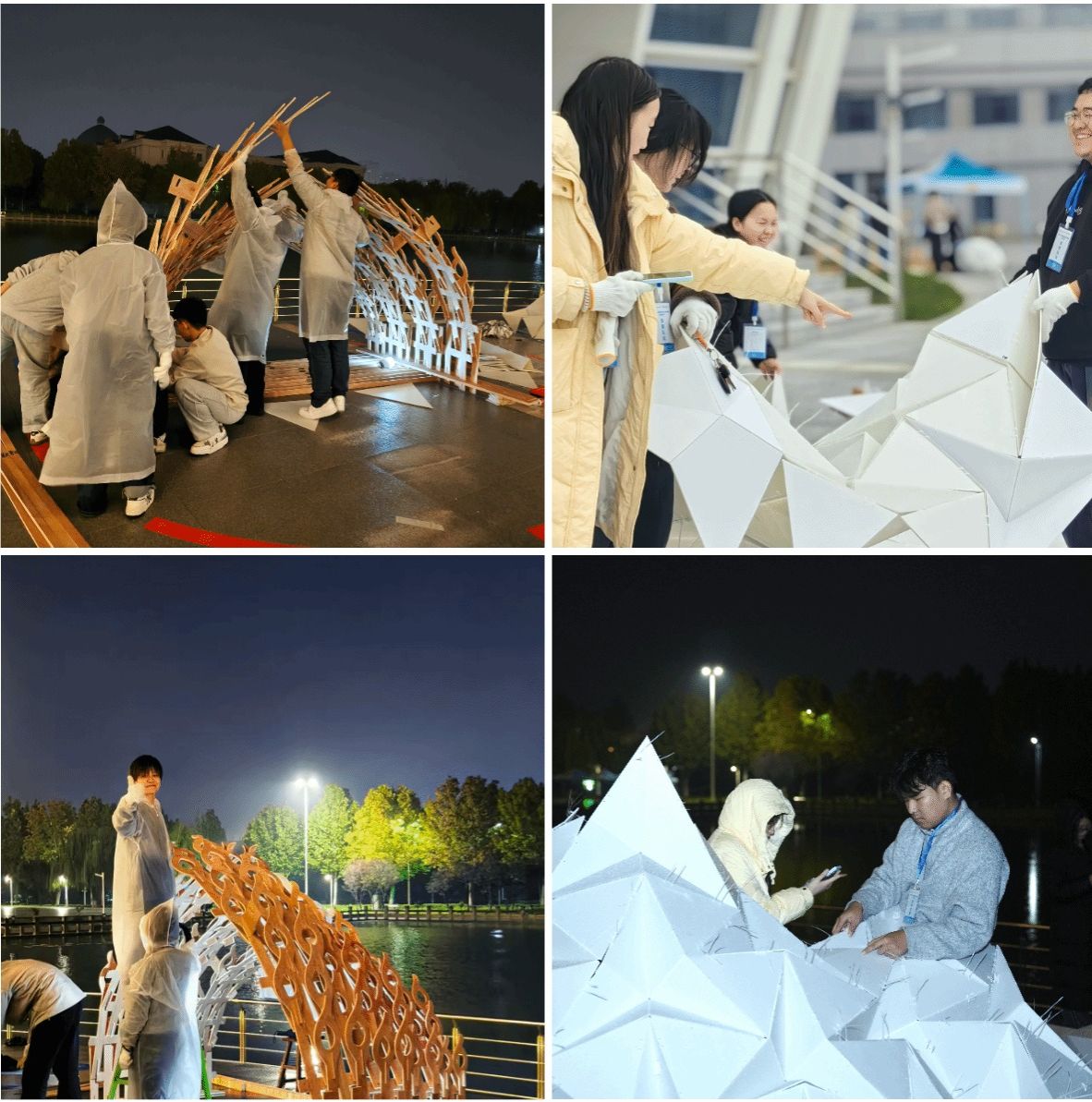 本届大赛以 “共・鸣” 为主题,要求参赛者在商丘师范学院冬泰湖音乐厅广场沿岸,搭建具有驻足吸引力的实体模型,重点探讨人与环境、技术之间的交互关系。我校代表队紧扣主题,作品立足 “经典与革新”“实用性与实验性” 的深度融合,充分展现了学子对未来建筑发展趋势的积极思考与创新探索。在设计与建造过程中,同学们综合运用标准化模块设计、参数化建模、仿生设计、建构逻辑分析、材料性能导向设计、数控切割技术及模块化组装技术等专业方法,将课堂所学知识转化为实践成果,实现了理论与实操的高效结合。