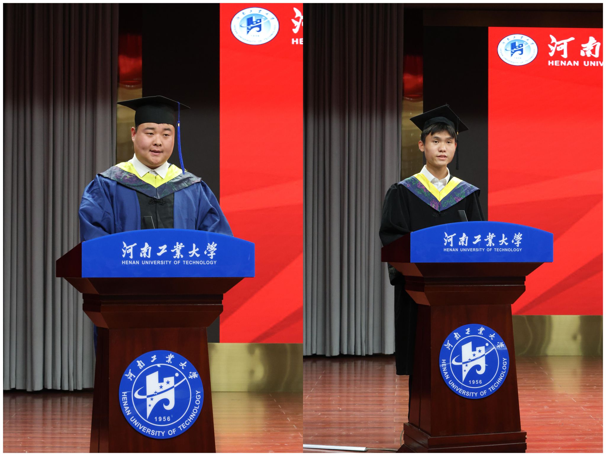 毕业典礼在庄严的国歌声中拉开帷幕。副院长魏凤春介绍了学院2025届毕业生基本情况、学位授予情况及荣誉学士学位授予情况,院党委书记车愔宣读了《河南工业大学关于表彰2025年优秀应届毕业生的决定》,副院长彭进宣读了《河南工业大学关于聘任2025届校友联络员的决定》。