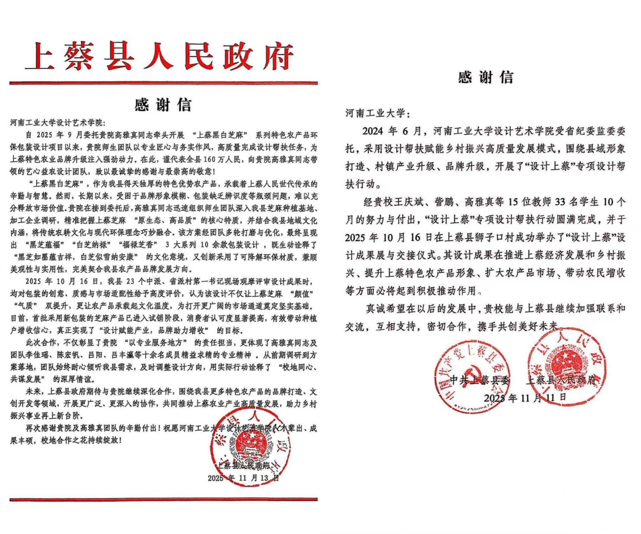 近日,河南省上蔡县委、县政府及黄埠镇人民政府先后向河南工业大学发来感谢信,对我校设计艺术学院师生团队在“设计上蔡”专项帮扶行动中取得的卓越成效予以高度肯定,向团队的辛勤付出致以诚挚谢意。