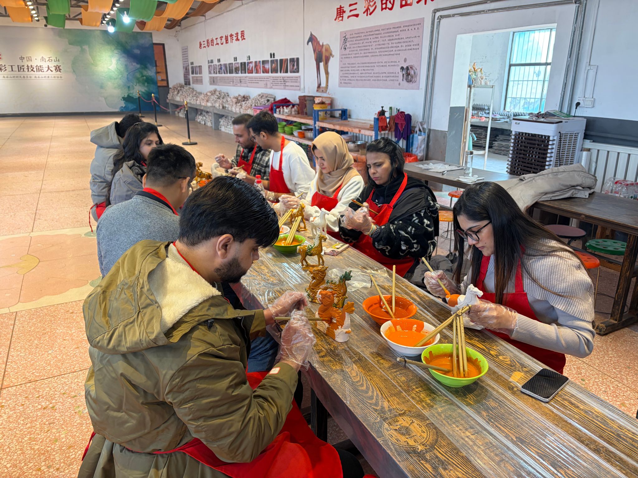 在11日上午,同学们走进洛谷工艺有限公司,与国家级非遗唐三彩展开近距离接触。在参观琳琅满目的唐三彩成品后,大家深入了解了制坯、烧造、施釉等繁复精妙的制作工序,随后,留学生们亲身体验释釉环节,手持釉料笔,小心翼翼地为素坯涂抹釉彩,看着釉色在胎体上缓缓晕染、流淌,在指尖与釉彩的触碰间,真切触摸到非遗技艺传承千年的温度与生命力。