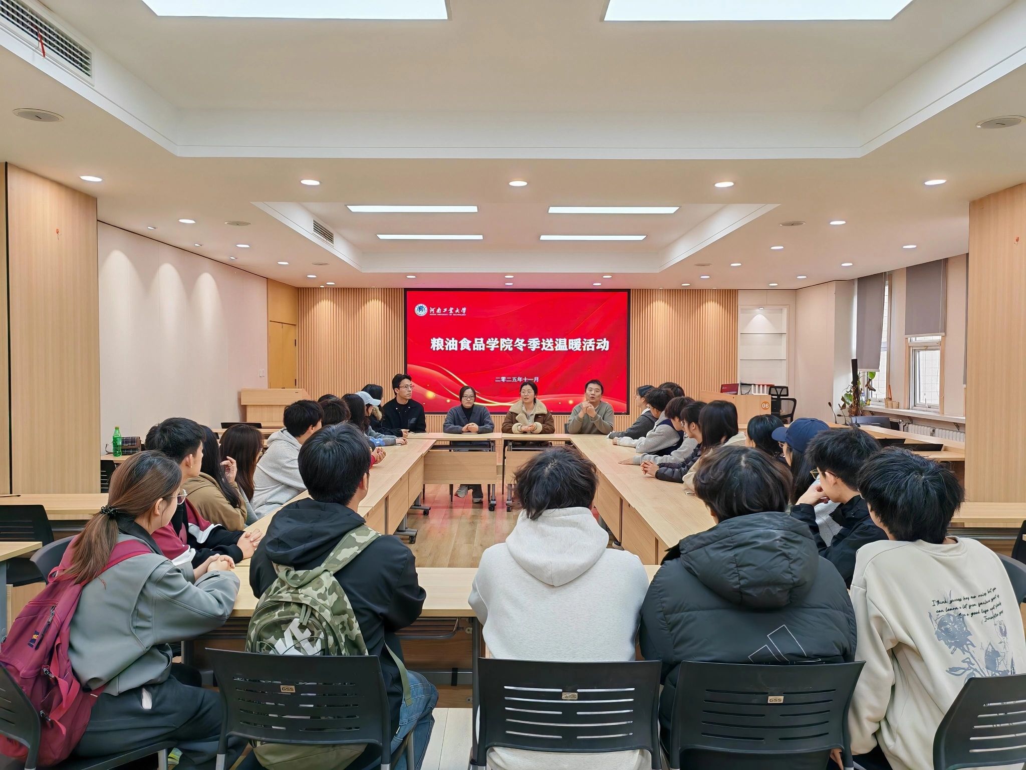 寒冬已至,暖意先行。为切实关怀学生校园生活,筑牢“一站式”学生社区育人阵地,让同学们在凛冽冬日感受到学院的温情与牵挂,11月10日,粮油食品学院于惟实楼捷赛厅成功开展冬季送温暖活动。学院各年级辅导员及学生代表共同参与,以实际行动为学子们送上冬日里的暖心关怀。